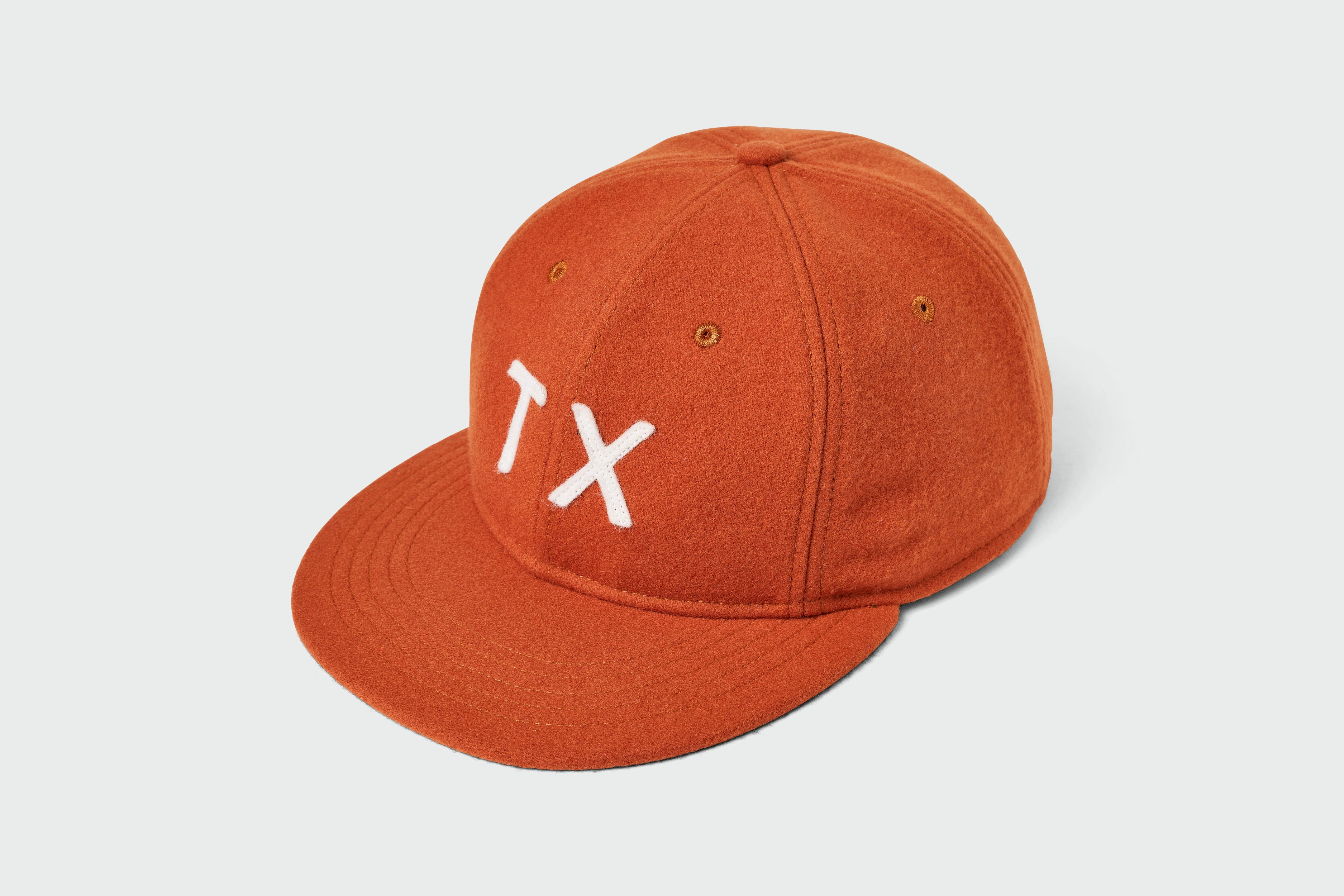 The Texas Wool Vintage Flatbill features an applique wool lettering with a leather strap and metal clasp closure. Sandlot Model 1735 6-Panel.