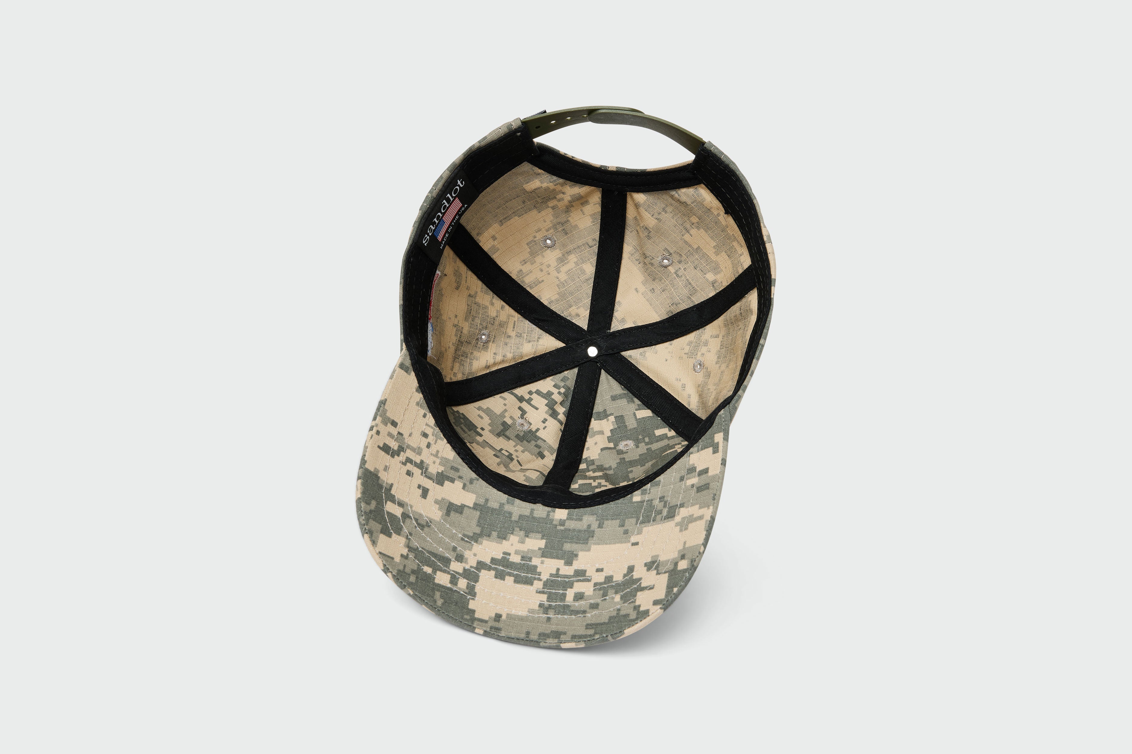 The UMKC Roos Camo Ripstop Dad Hat. Made with our new durable ripstop material and completed with a sewn on UMKC logo and an American Flag side it with an adjustable snapback closure. Sandlot Model 1810 Dad Hat.