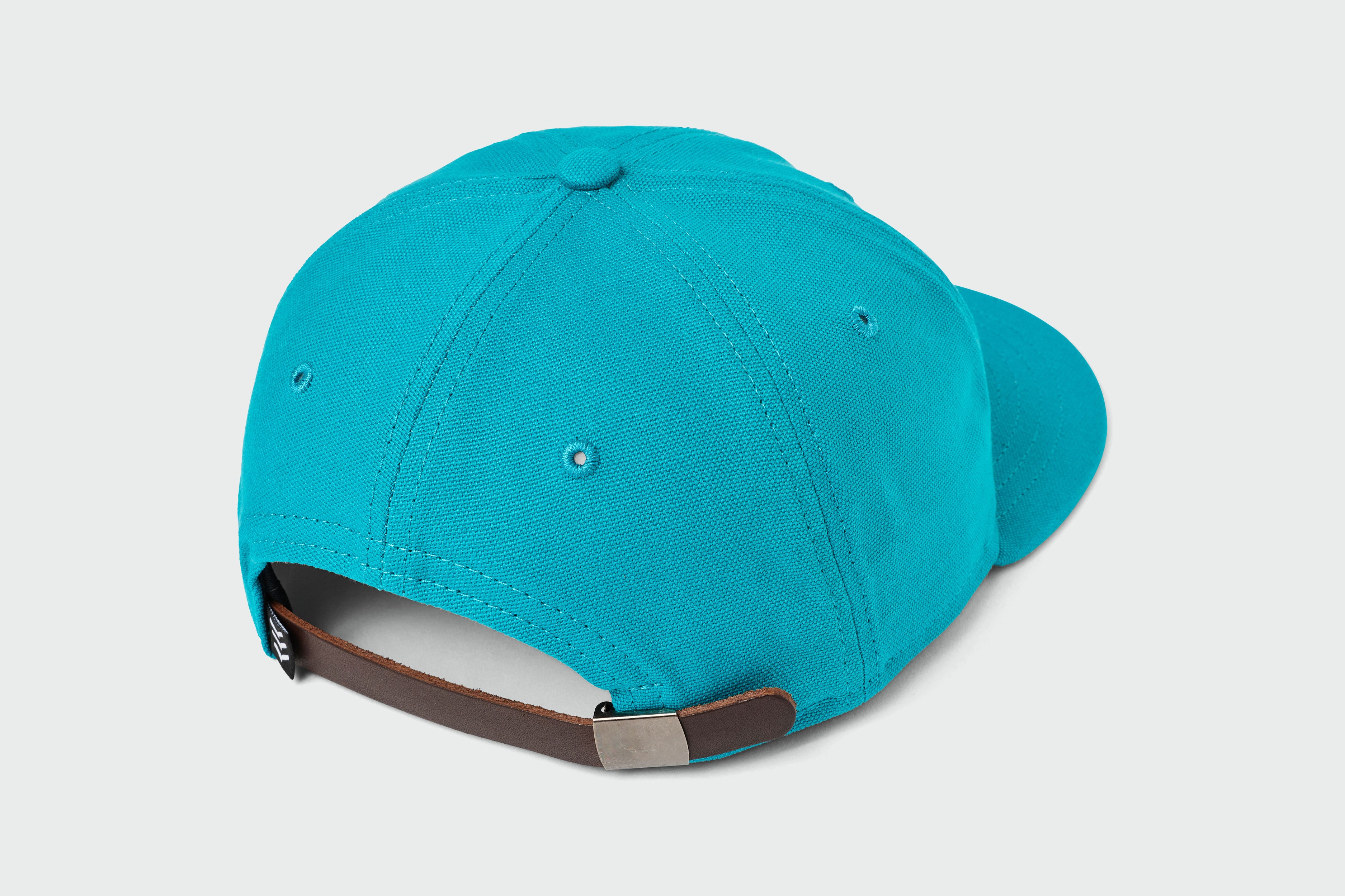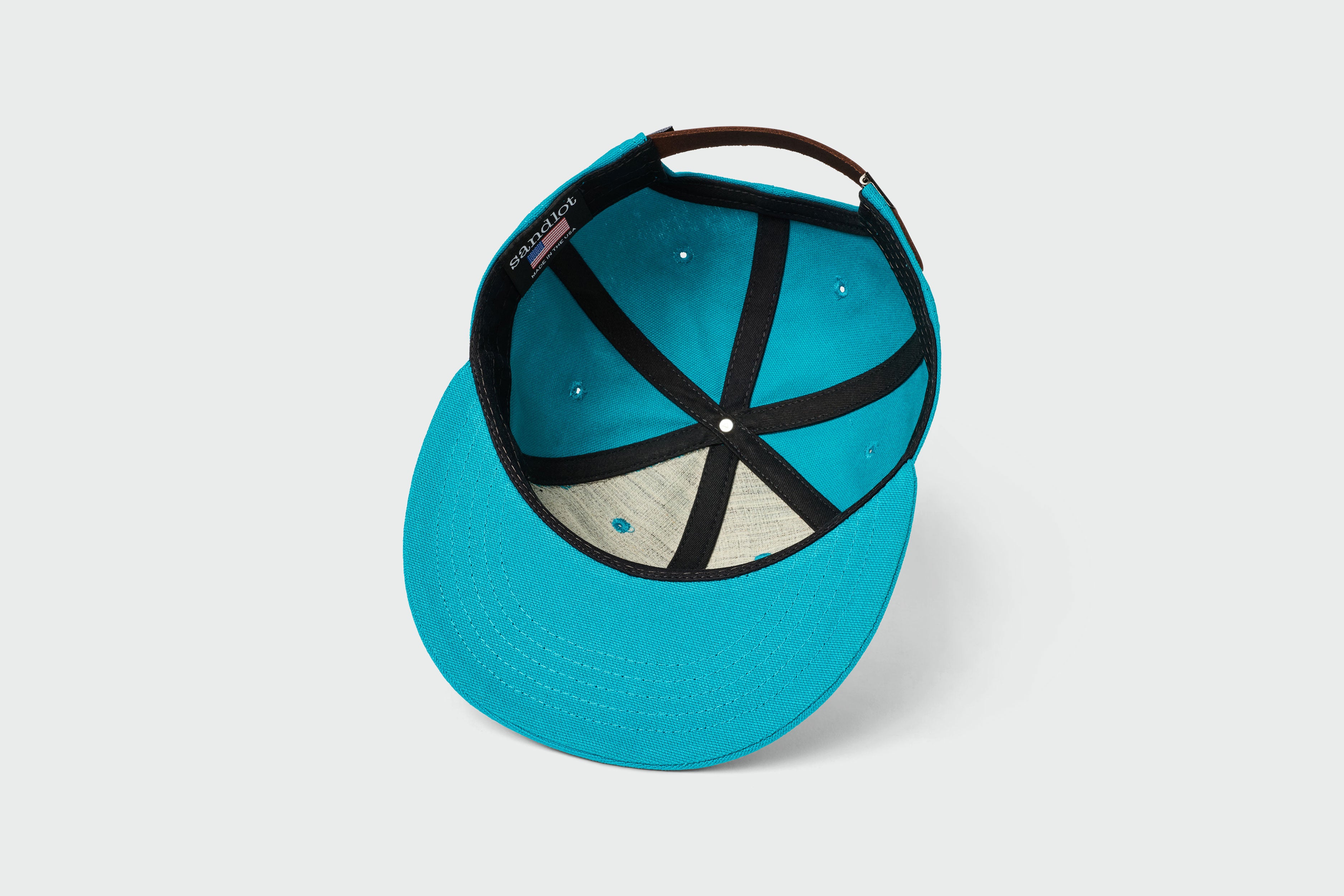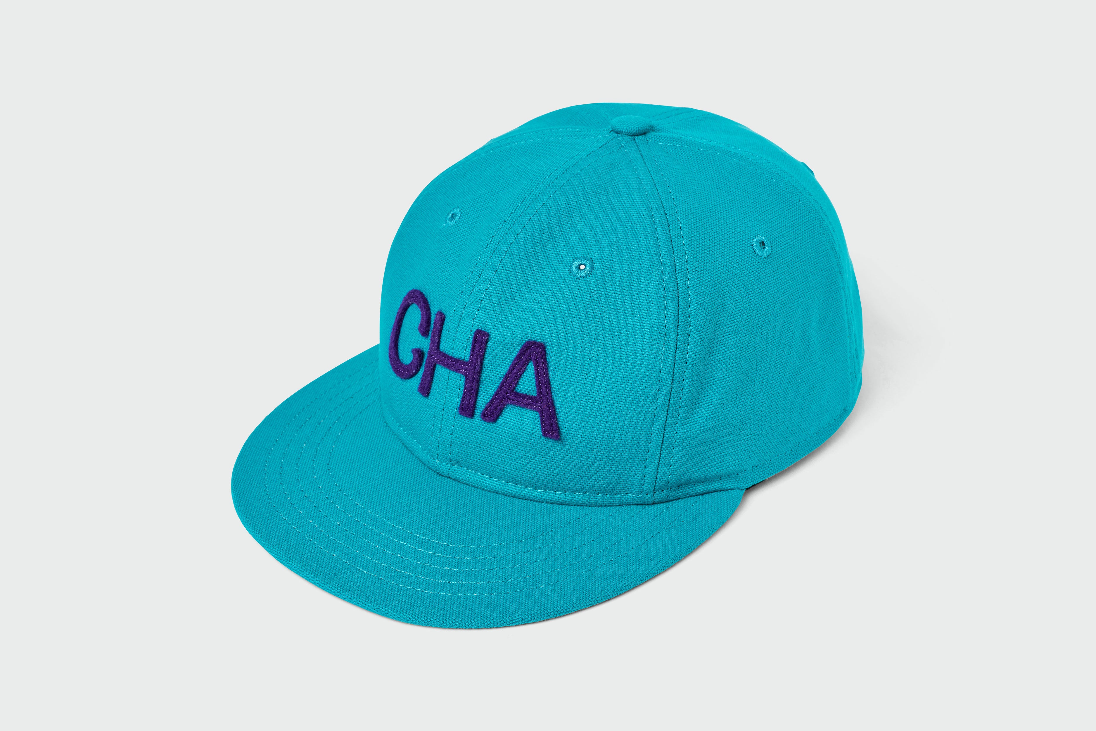 The Charlotte Canvas Vintage Flatbill features an applique wool lettering with a leather strap and metal clasp closure. Sandlot Model 1735 6-Panel.