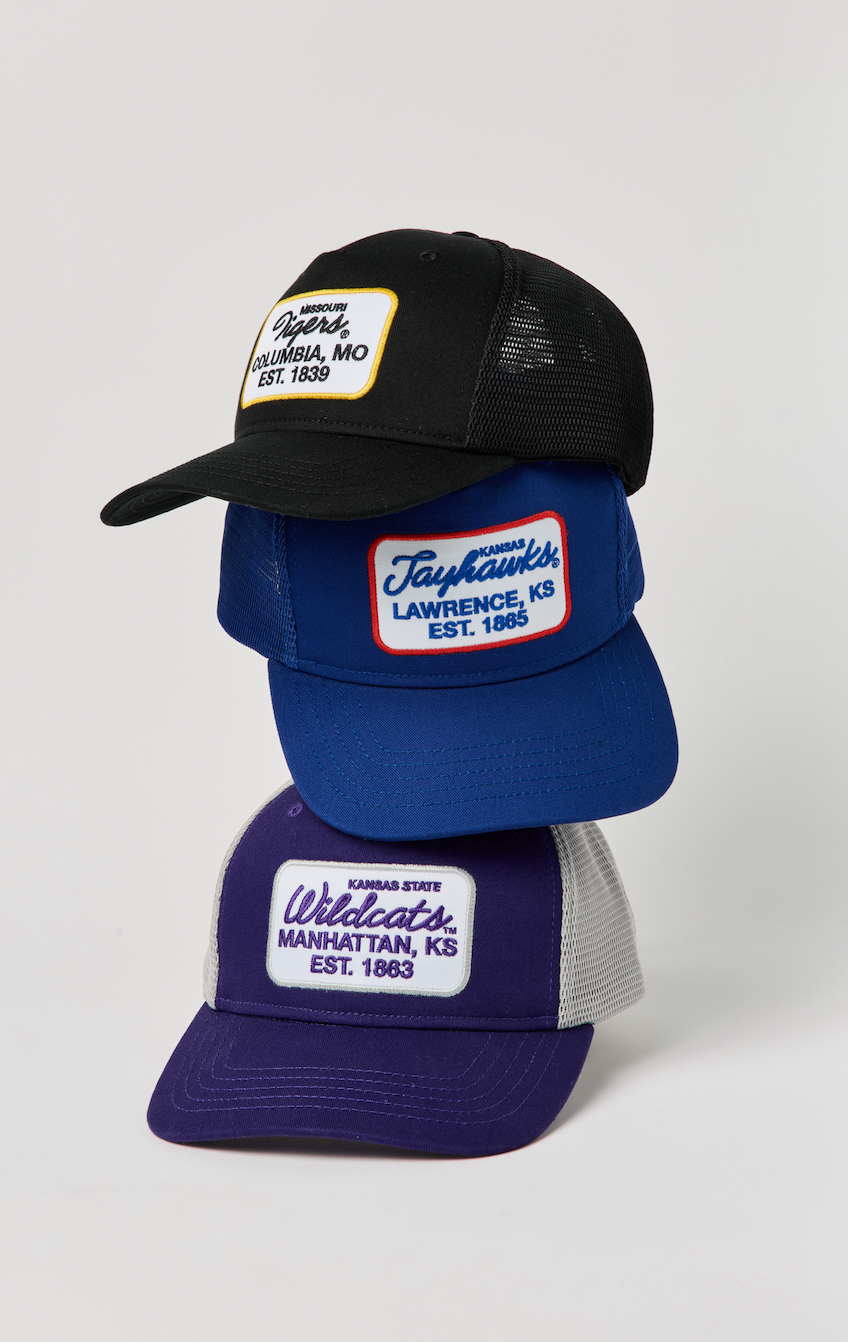 Cut and sewn in KC, this 100% cotton cap features a mesh backing with an adjustable snapback decorated with a Kansas Jayhawks Mechanics patch. Sandlot Model 2915T Trucker Hat